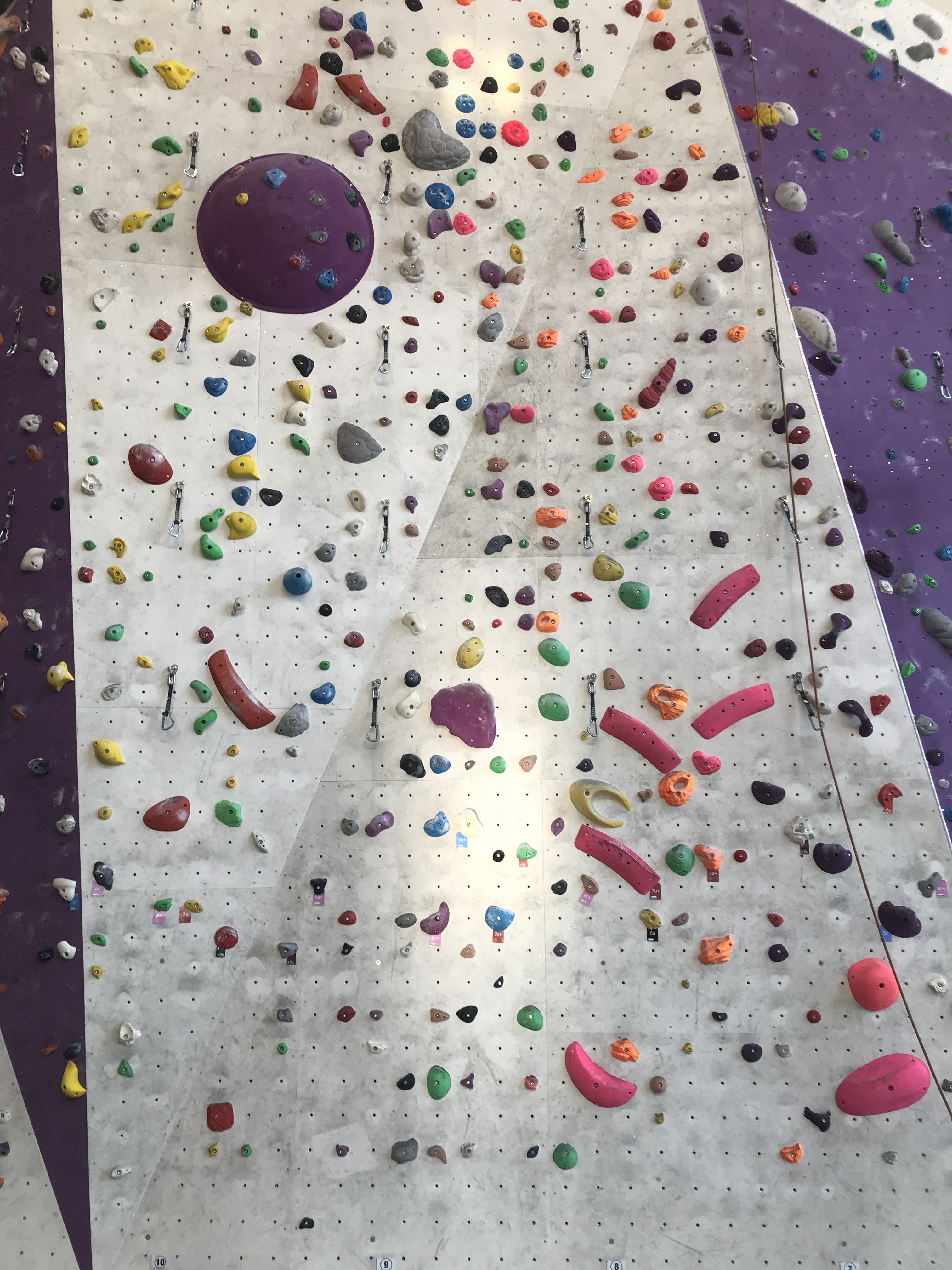 "La salle d'escalade est tjrs aussi impressionnante... Les parois claires laissent entrevoir les traces de chausson à gomme noire. Comme chez tt le monde on sent un ralentissement du renouvellement des voies avec une qualité de passage technique moindre des voies 5a...6a. Les douches sont fermées pour coût de l'énergie trop haute😥, dommage. Zone blocs plus accessible les prises sont propres. Ça fait plaisir de grimper de nouveau en bloc perso réalisé en fin de séance."