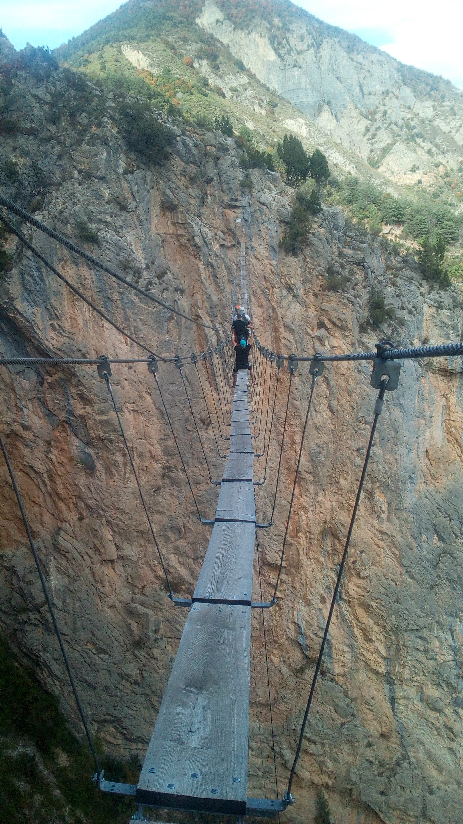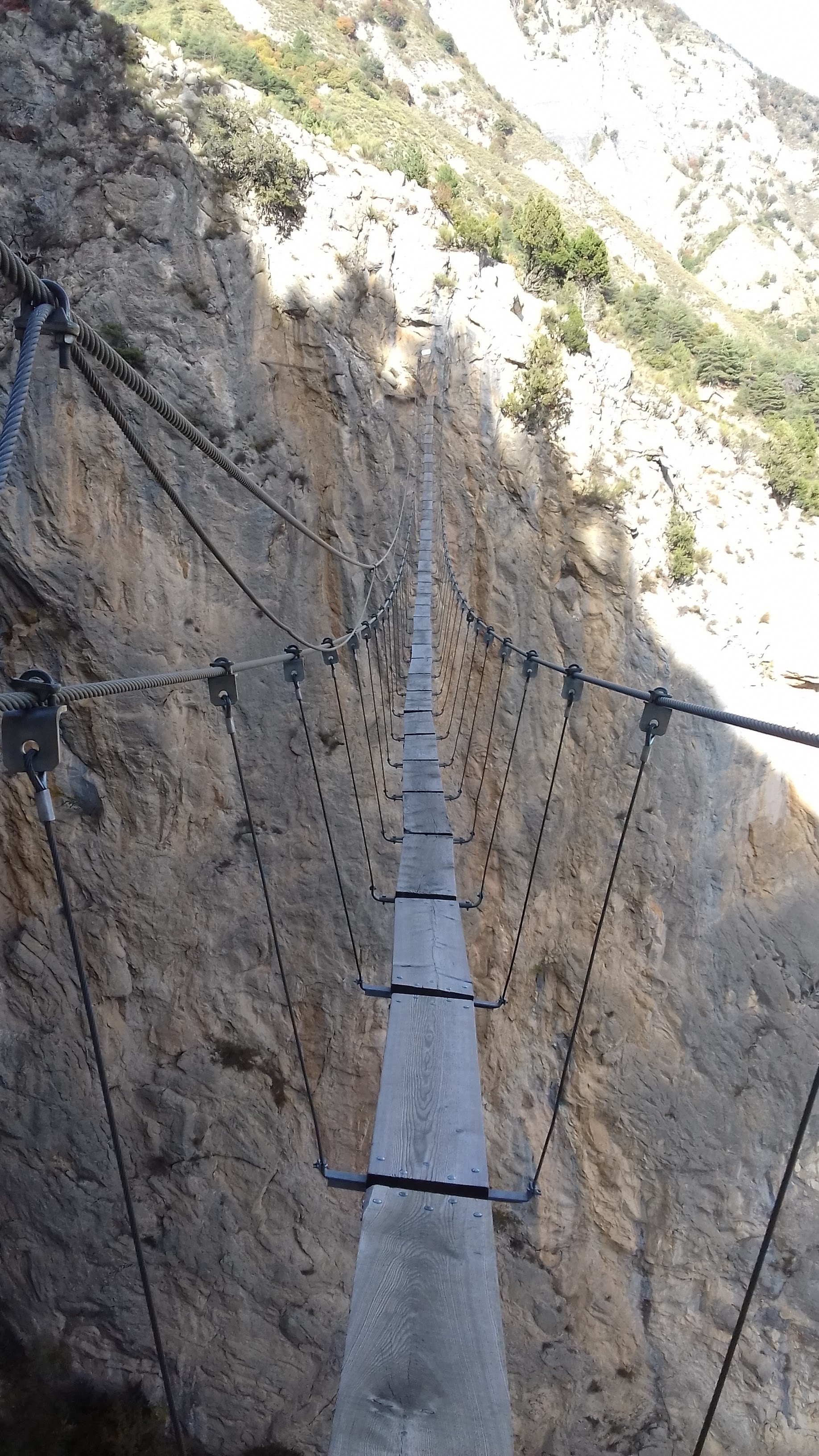 Située dans un coin désert des Alpes de Haute Provence, cette via très aérienne (parfois athlétique) est mémorable pour son impressionnante passerelle de 59m suspendue à 200m du sol, et son récent pont népalais où il est écrit en guise d'avertissement: passage qui nécessite force, équilibre et mental.