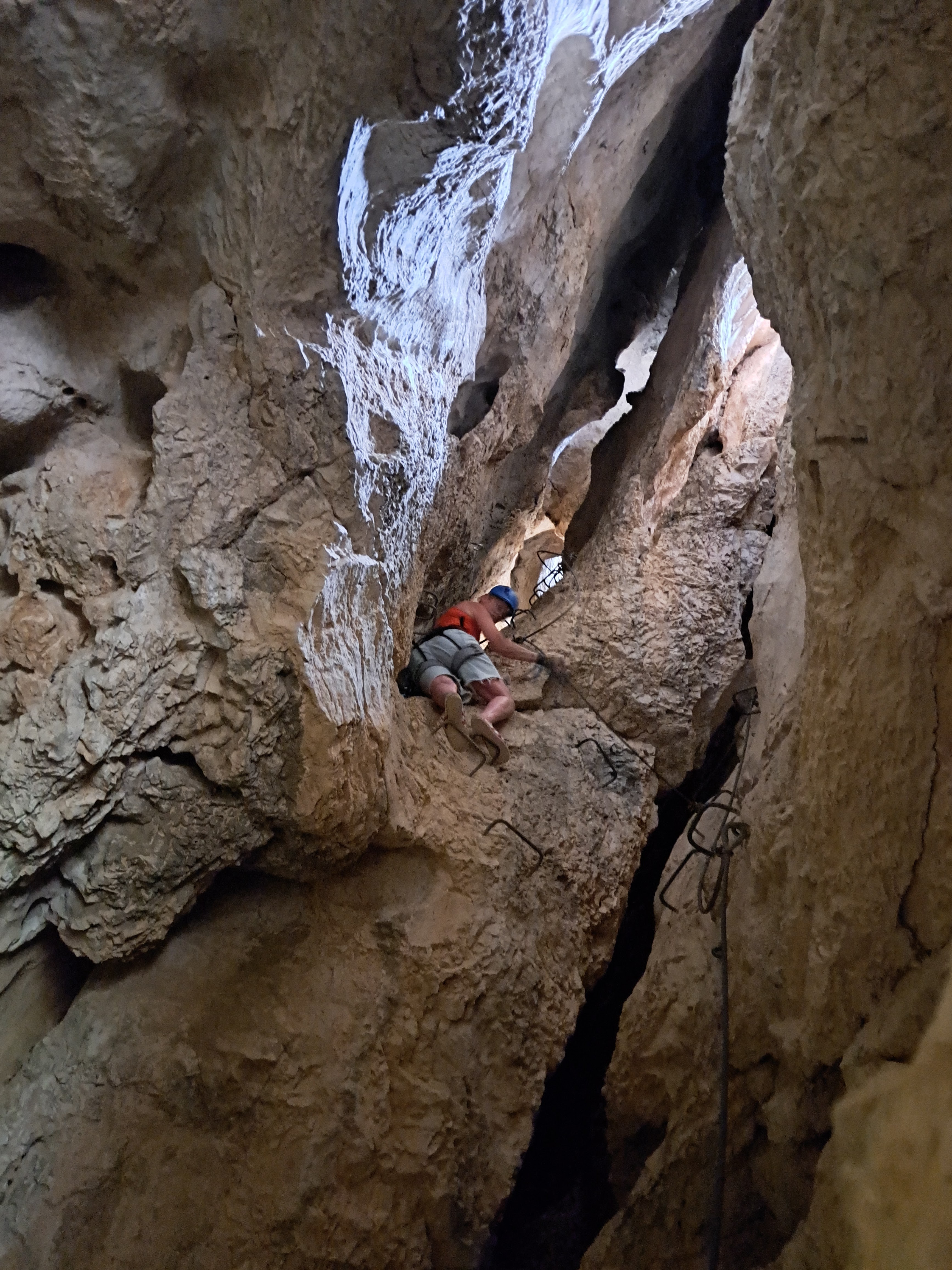Ma première Via Ferrata que je fais. Je ne le regrette vraiment pas, c'était vraiment cool. Le parcours n'est pas trop difficile et est très varié. Escalader, descendre en rappel, ramper dans une grotte, une courte tyrolienne. À la fin, vous pouviez choisir si vous souhaitiez tomber librement dans une grotte, ce qui était vraiment cool. Sortir de la grotte a été tout un défi, mais il n'est pas nécessaire d'être claustrophobe pour cela. Les conseils que vous avez reçus étaient également soignés et professionnels.