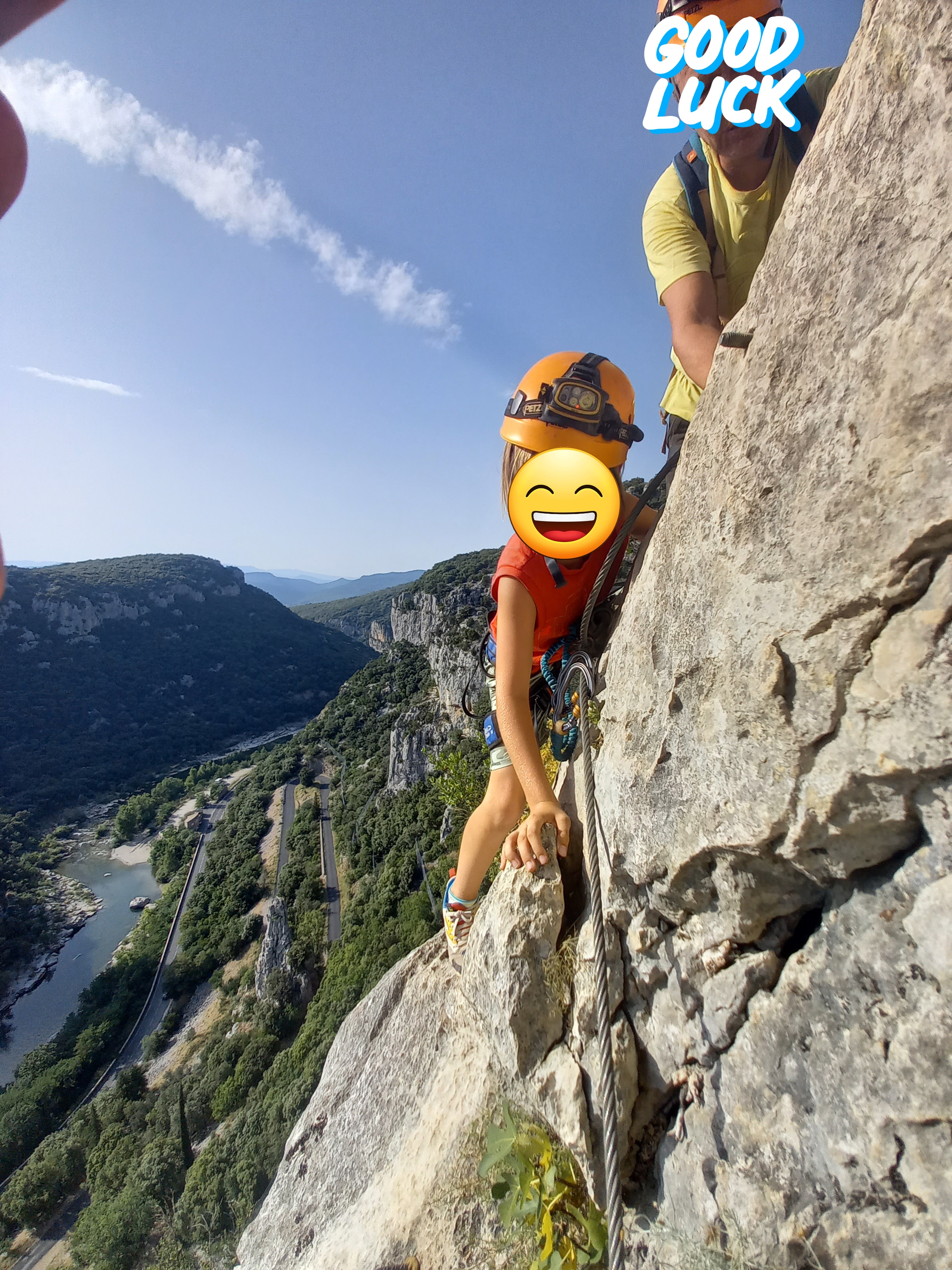 Très belle voie, nous avions deux jeunes ados de 12 ans pour qui la fin a été difficile. Juste un commentaire, sur certains sites elle est donnée pour 1 h et pour des enfants à partir de 6 ans. Cela concerne uniquement la première partie. Si vous choissisez de faire la deuxième, c'est 3 h et clairement pas pour des enfants de 6 ans. La marche d'approche est assez mal indiquée, le retour aussi d'ailleurs, mais on ne peut pas se perdre, il suffit de longer autant que possible la falaise, certains chemins sont compliqués pour de jeunes enfants. Vraiment une voie magnifique, paysages grandioses, un peu de technique, un peu de sport et de dépassement de soi, les ados étaient très fiers d'avoir grimpé 3h.